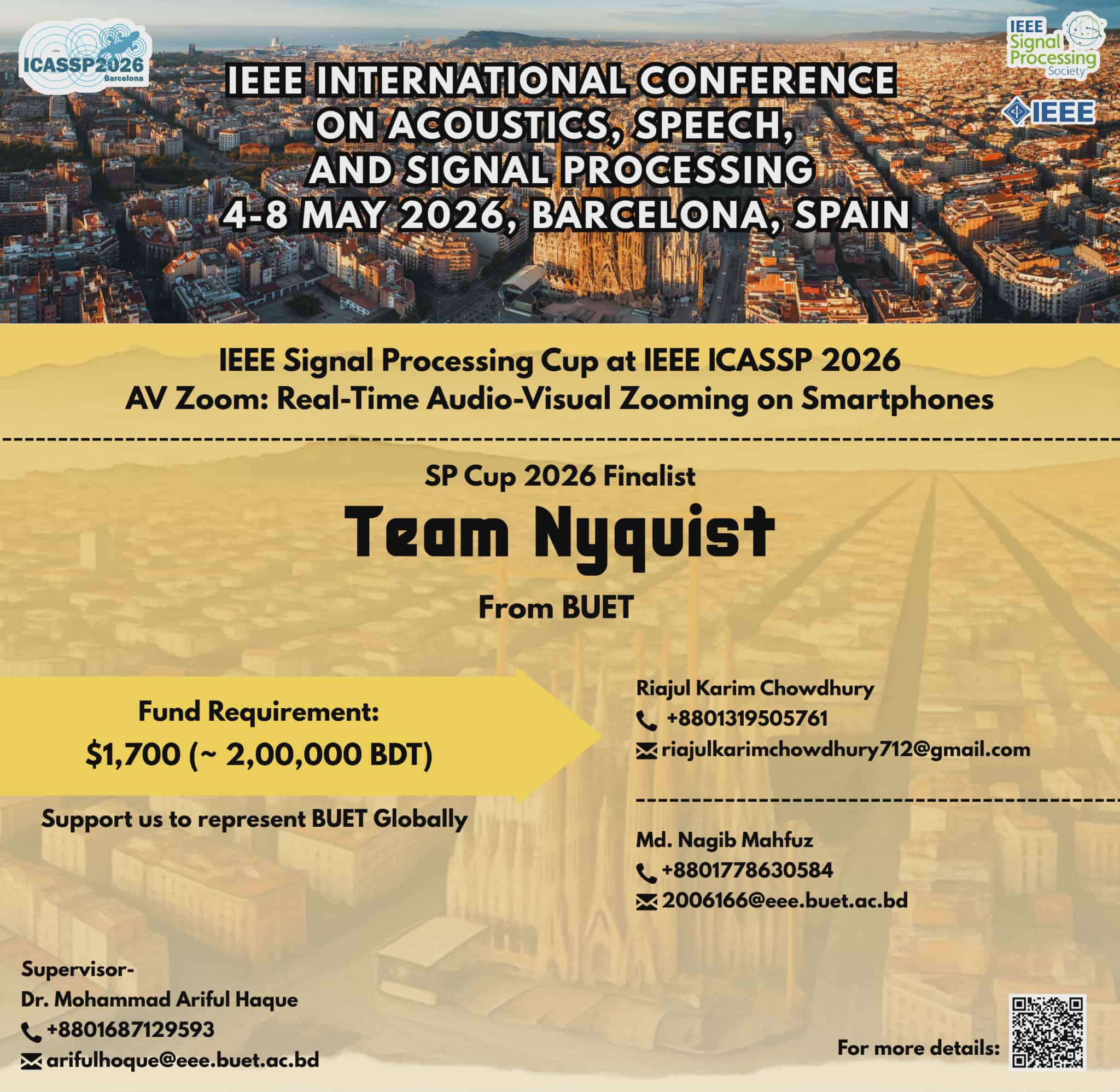 We are delighted to share that Team Nyquist from BUET (EEE) has been selected as one of the Top 3 Finalists of the IEEE Signal Processing Cup 2026, which will take place at ICASSP 2026 in Barcelona, Spain, on 4–8 May 2026.